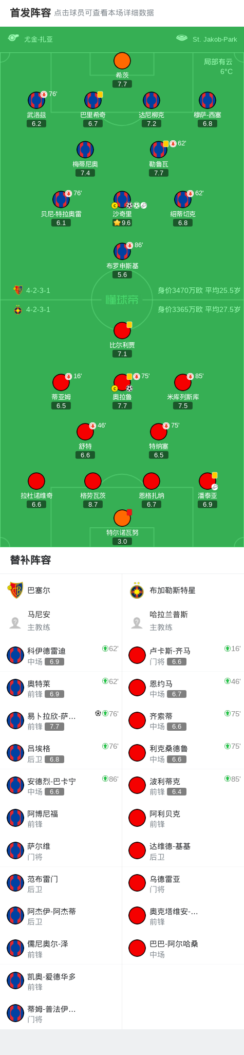 北京时间11月7日欧足联欧洲联赛 联赛阶段 第4轮,巴塞尔对阵布加勒斯特星。巴塞尔沙奇里梅开二度,易卜拉欣-萨拉赫破门。布加勒斯特星奥拉鲁破门。最终比分巴塞尔 3 - 1 布加勒斯特星。